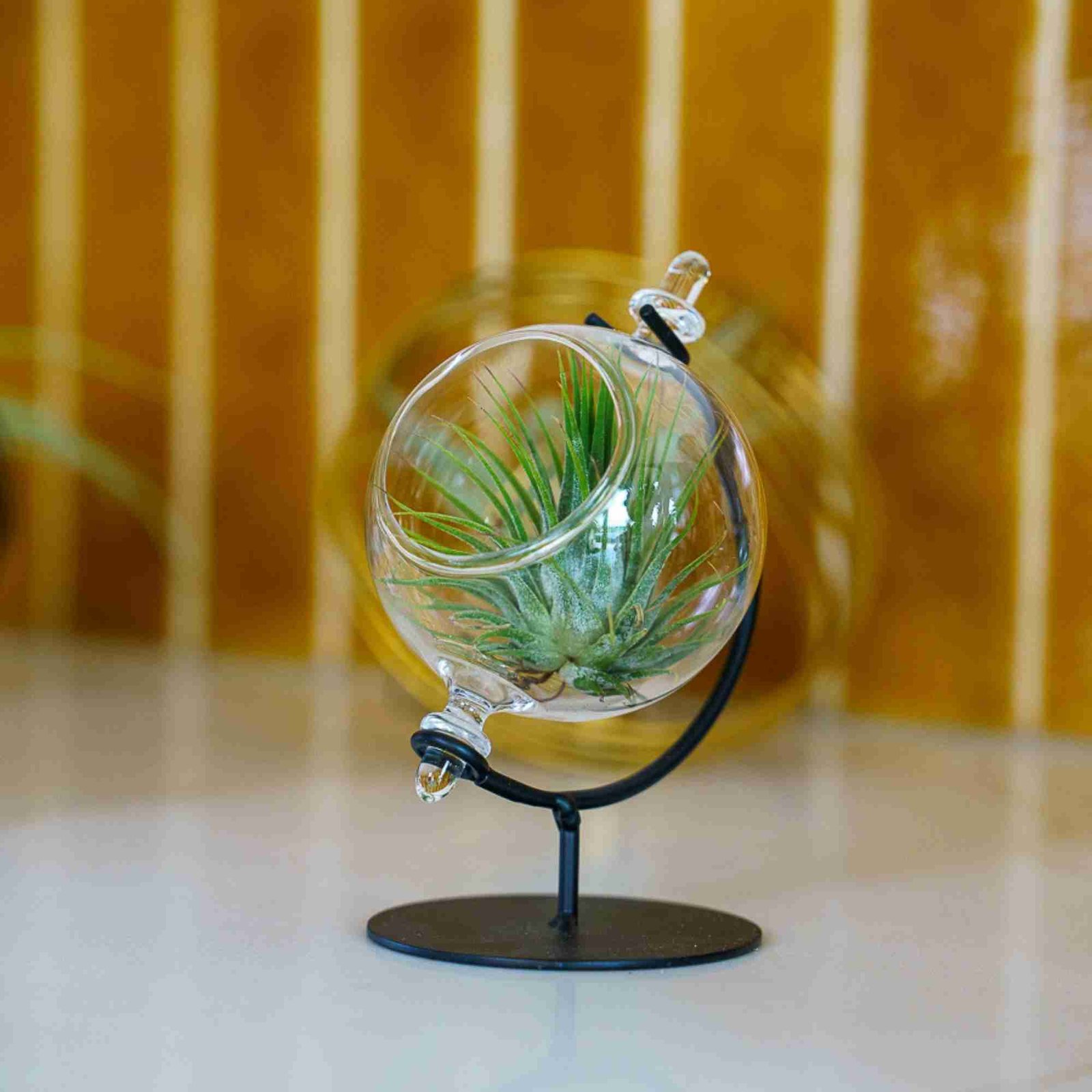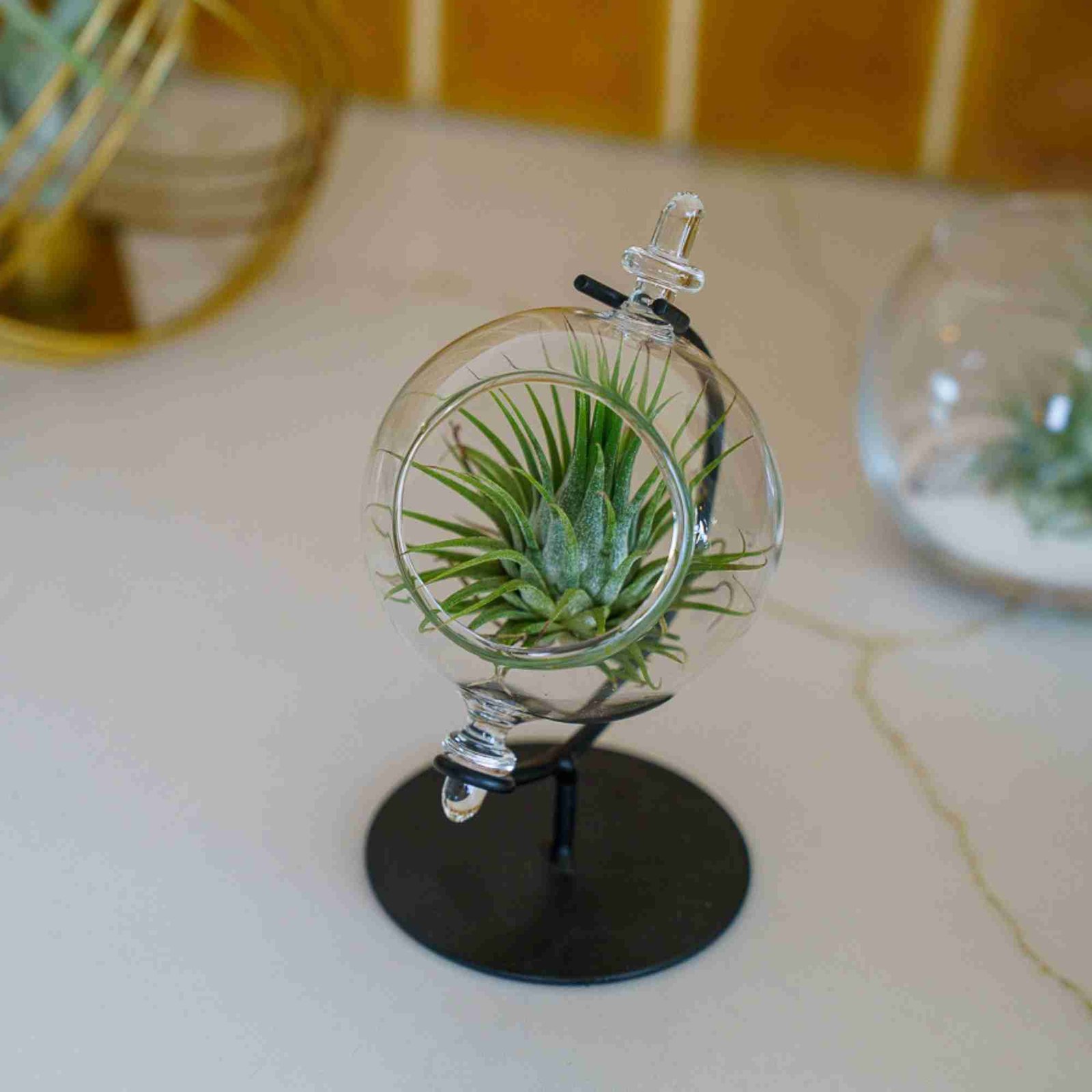 This glass globe in holder has the shape of a globe. With the globe we supply a red or green ionantha. Super fun to give as a gift for Mother's Day, a birthday or other special occasion. The globe fits perfectly on a cupboard, shelf or in the window frame. Please make sure that the ionantha is not in direct sunlight. It is also good to know that the red color of the ionantha has been activated by the grower. The red color will therefore also diminish somewhat and eventually the Tillandsia can die after 6-8 weeks.
